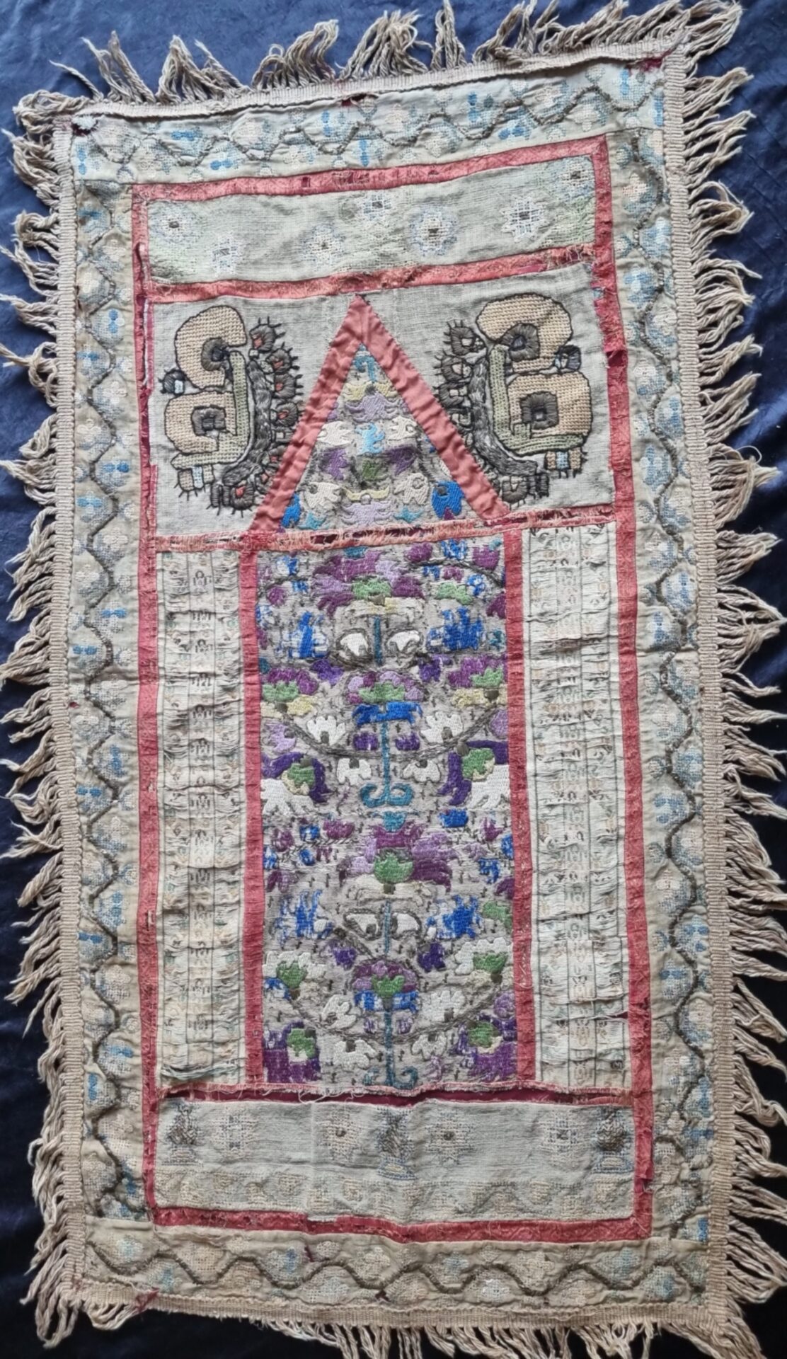 Ottoman Greek embroidery arched prayer panel known as a quibla.Size: 85cm x 44 cm. It is composed of various antique Ottoman Greek embroideries in order to create a prayer mat, which are probably from the 19th with some possibly earlier. Qiblehs were primarily used by women to hang on the wall of a house or a tent during prayer.